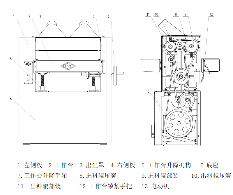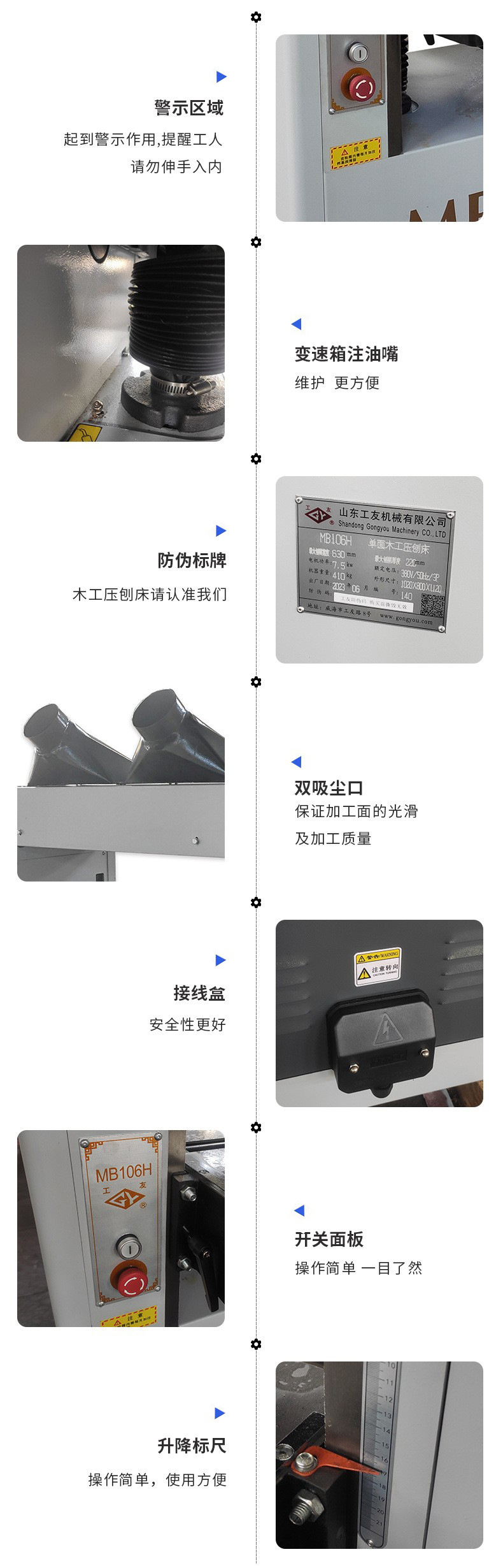 該機(jī)床送料平穩(wěn),前壓輥采用分段活動(dòng)結(jié)構(gòu),可同時(shí)送入厚度相差2毫米以?xún)?nèi)的多塊材料;前后壓料器調(diào)節(jié)方便,可加工薄板;工作臺(tái)升降裝置結(jié)構(gòu)合理,操作平穩(wěn)輕便;獨(dú)特的主軸結(jié)構(gòu),保證良好的加工質(zhì)量。該機(jī)具有兩級(jí)送料速度,可滿(mǎn)足不同加工工件的要求。